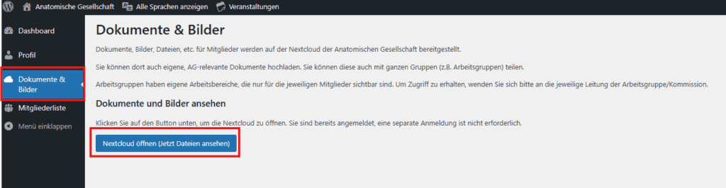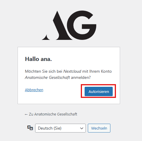 Sie werden dann automatisch in der Nextcloud (ähnlich iCloud, Google Drive, OneShare,...) der Anatomischen Gesellschaft angemeldet.